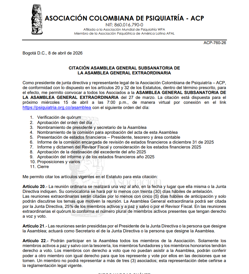 La Asociación Colombiana de Psiquiatría está comprometida con el cumplimiento de sus estatutos, la satisfacción de sus Asociados, el entorno científico, el sector salud y la comunidad en general y con el mejoramiento continuo de su gestión.